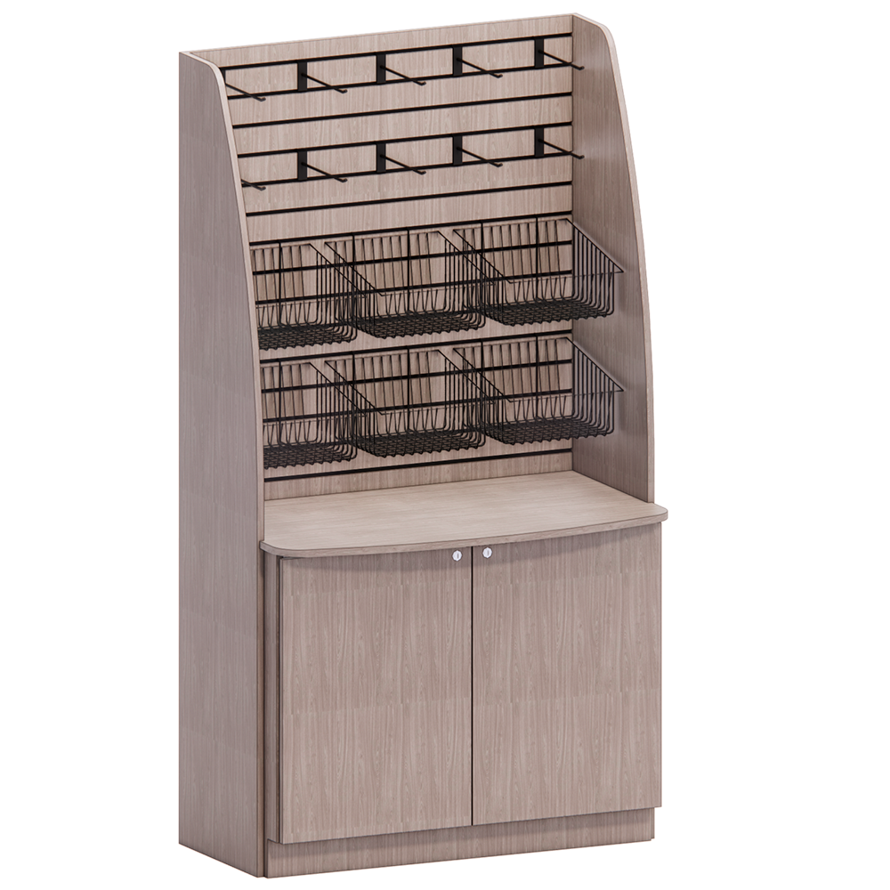 The FSASMCB is a remarkable design that integrates a half-height slatwall system and a eurostyle cabinet base into one unique product.
