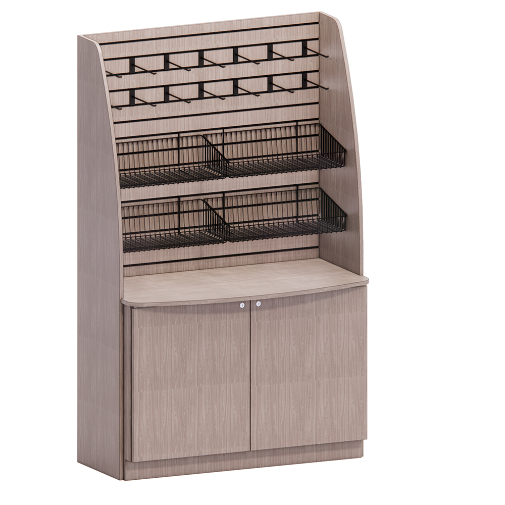 The FSASMCB is a remarkable design that integrates a half-height slatwall system and a eurostyle cabinet base into one unique product.