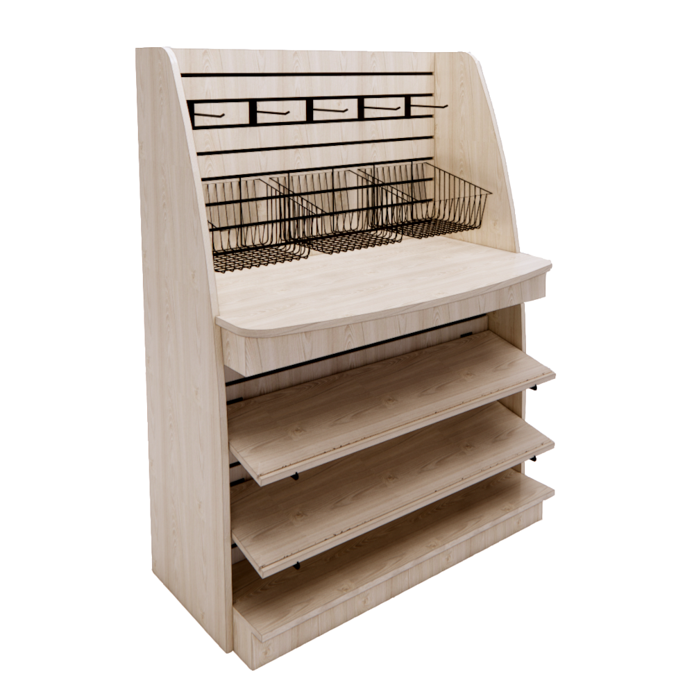 The FSLSUMB fixture is a 60″ tall fixture that is a member of the FSLS-Series. This product includes a full width slatwall back panel system both above and below the rigid countertop.