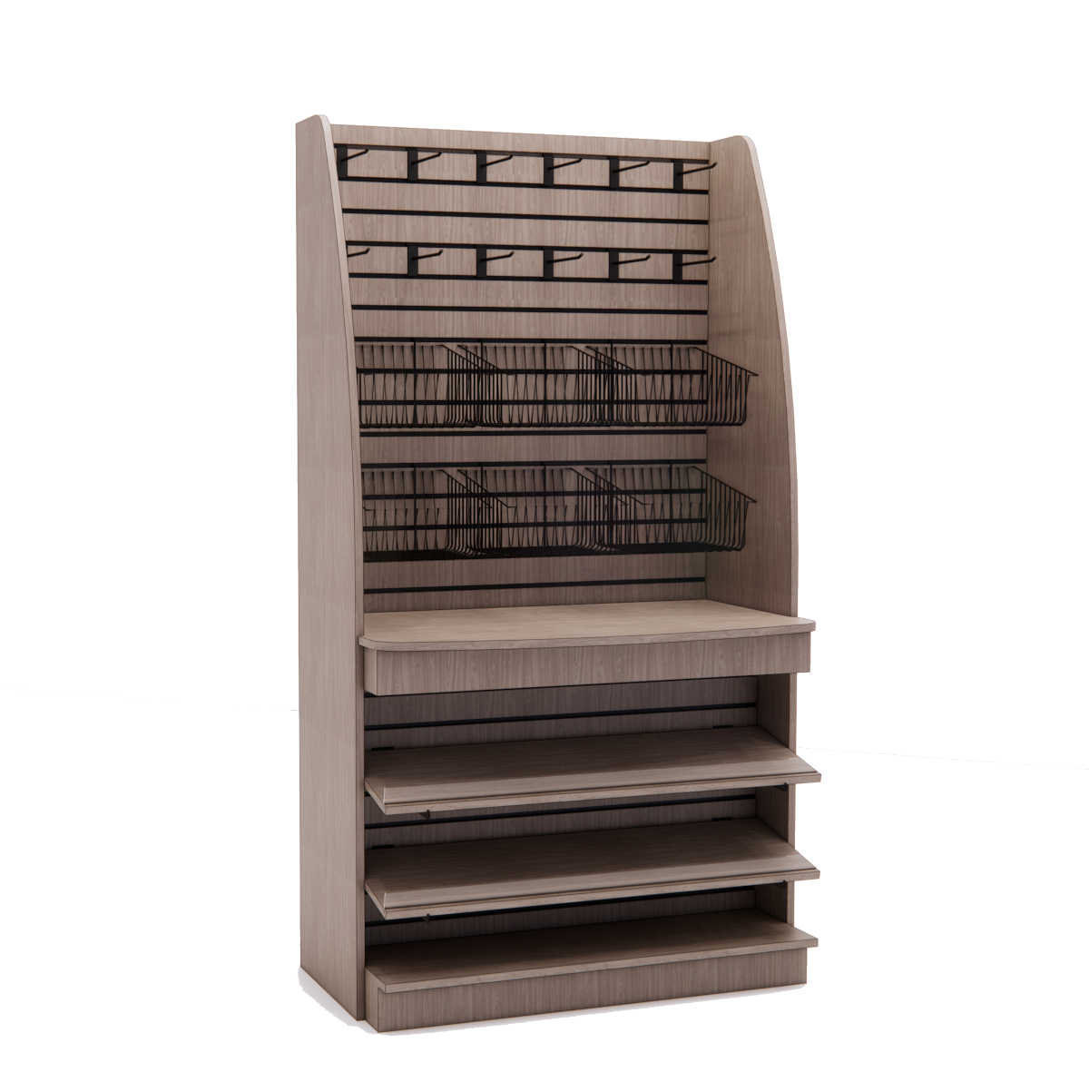 The FSUMB is equipped with a rigid countertop and an integrated undercounter merchandiser slatwall system constructed using high pressure laminate.