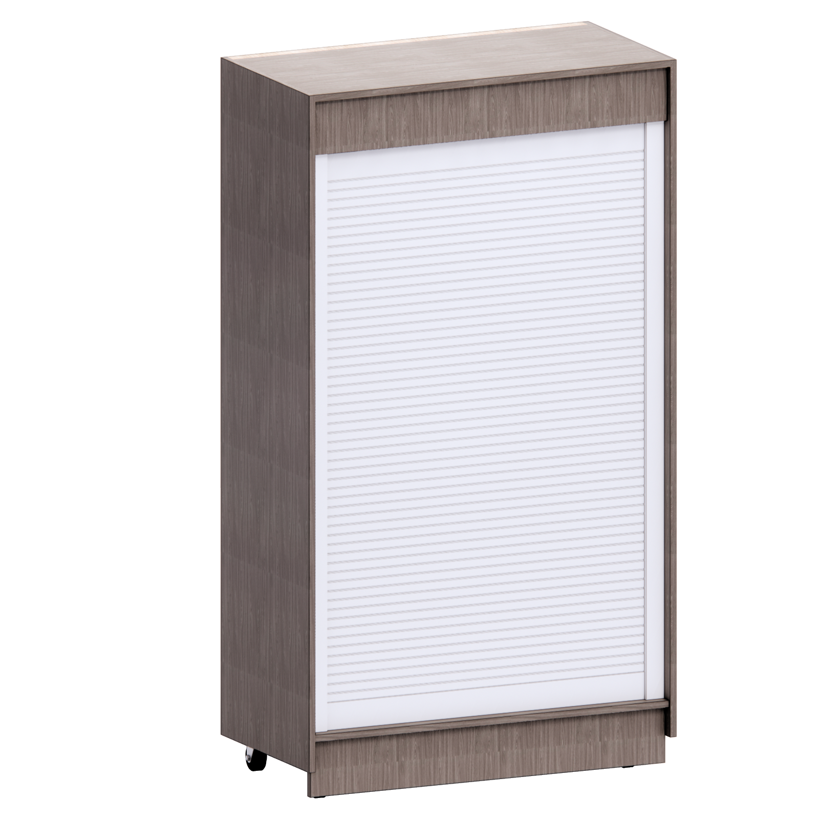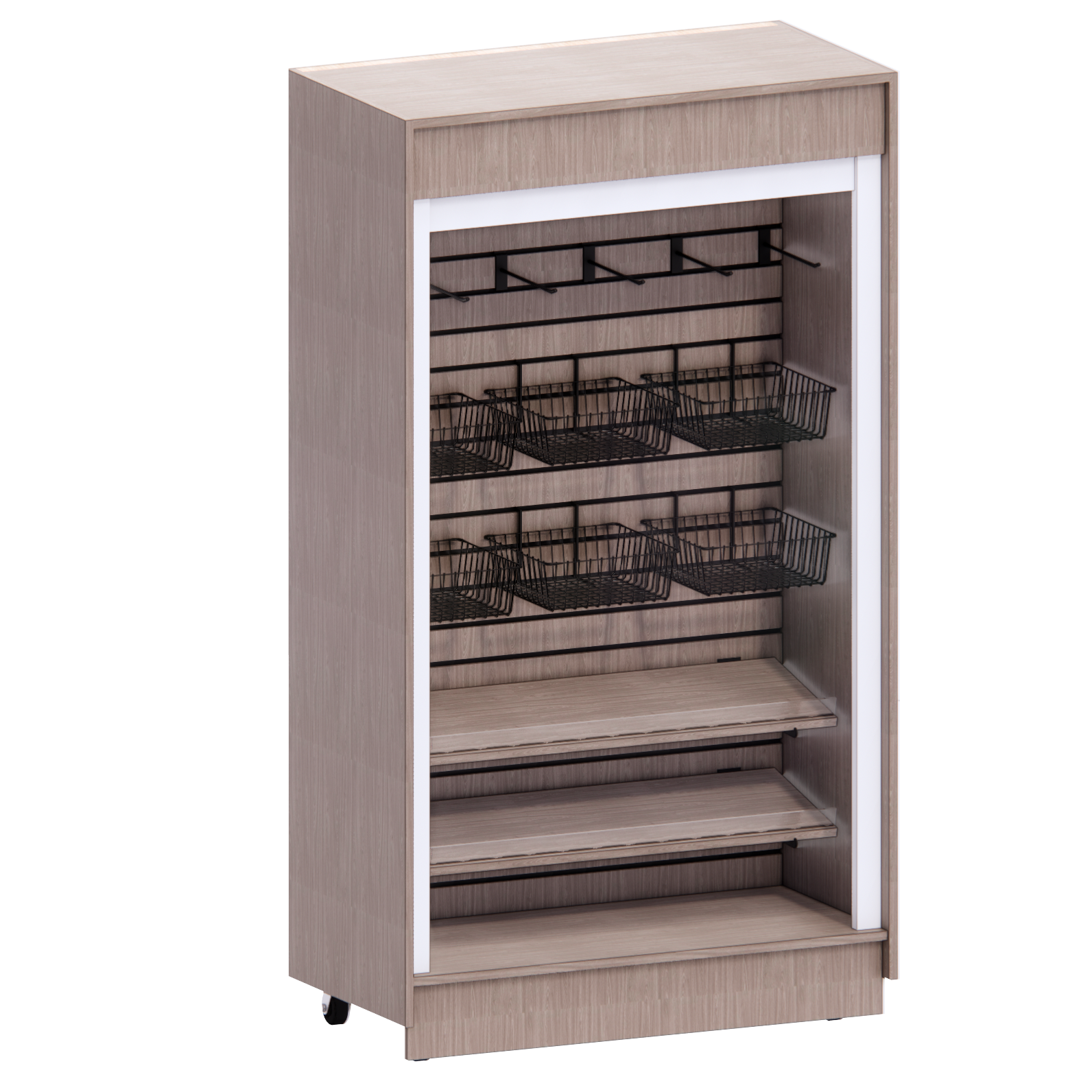 The IFSM-RG-M, In-Line Free Standing Merchandiser with Roll-Down Gate and Casters, is 78” tall. The IFSM-RG-M features a full-height slat wall and sturdy plywood frame construction. The integrated roll-down gate lets you easily secure the merchandiser, locking contents safely inside when not in use. This merchandiser has multiple hardware packages to amplify your merchandising opportunities. Hardware packages include baskets, slat wall hooks, and adjustable shelves. LED lighting is positioned behind the valance to illuminate your display. The IFSM-RG-M ships fully assembled.