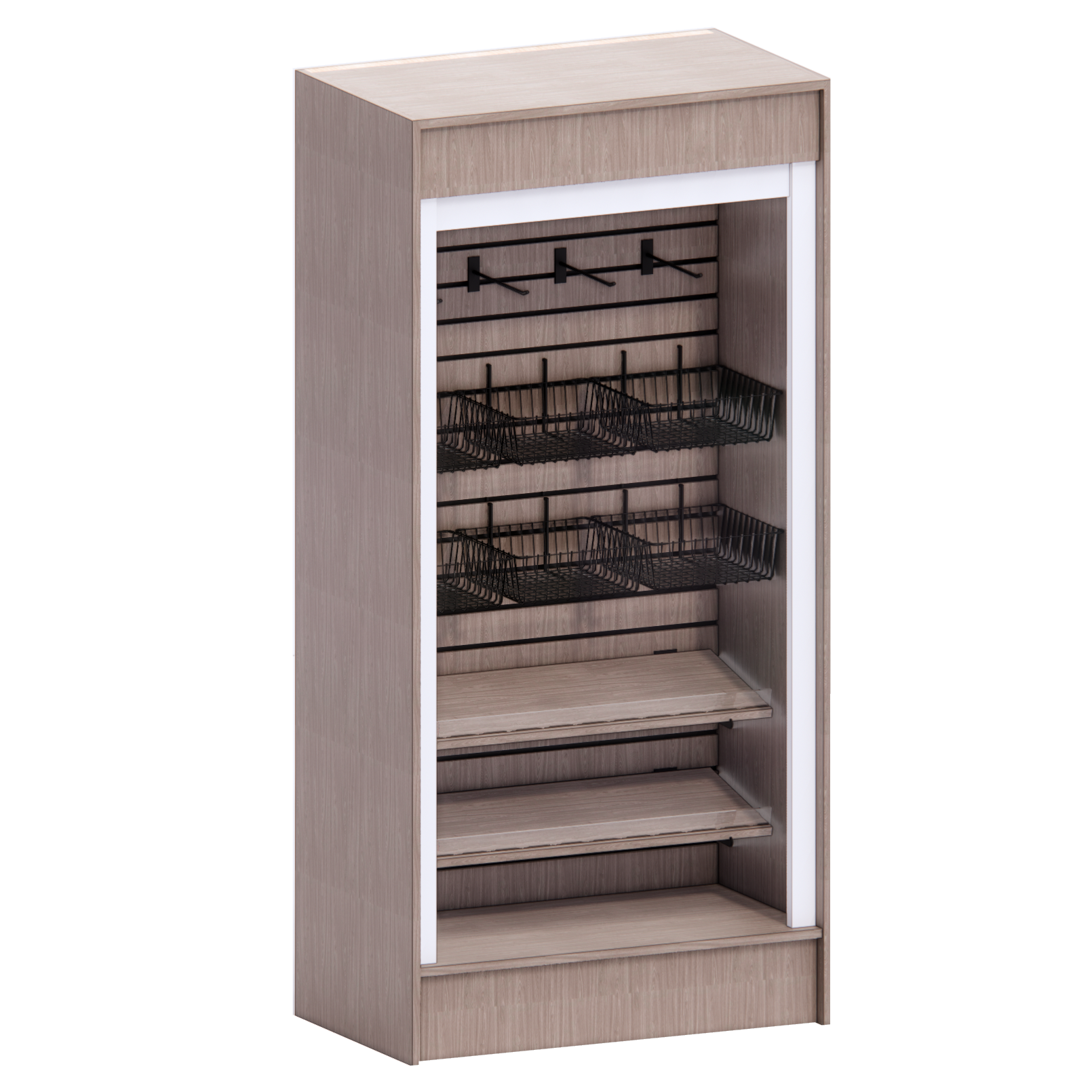 The IFSM-RG, In-Line Free Standing Merchandiser with Roll-Down Gate, is 78” tall. The IFSM-RG features a full-height slat wall and sturdy plywood frame construction. The integrated roll-down gate lets you easily secure the merchandiser, locking contents safely inside when not in use. This merchandiser has multiple hardware packages to amplify your merchandising opportunities. Hardware packages include baskets, slat wall hooks, and adjustable shelves. LED lighting is positioned behind the valance to illuminate your display. The IFSM-RG ships fully assembled.