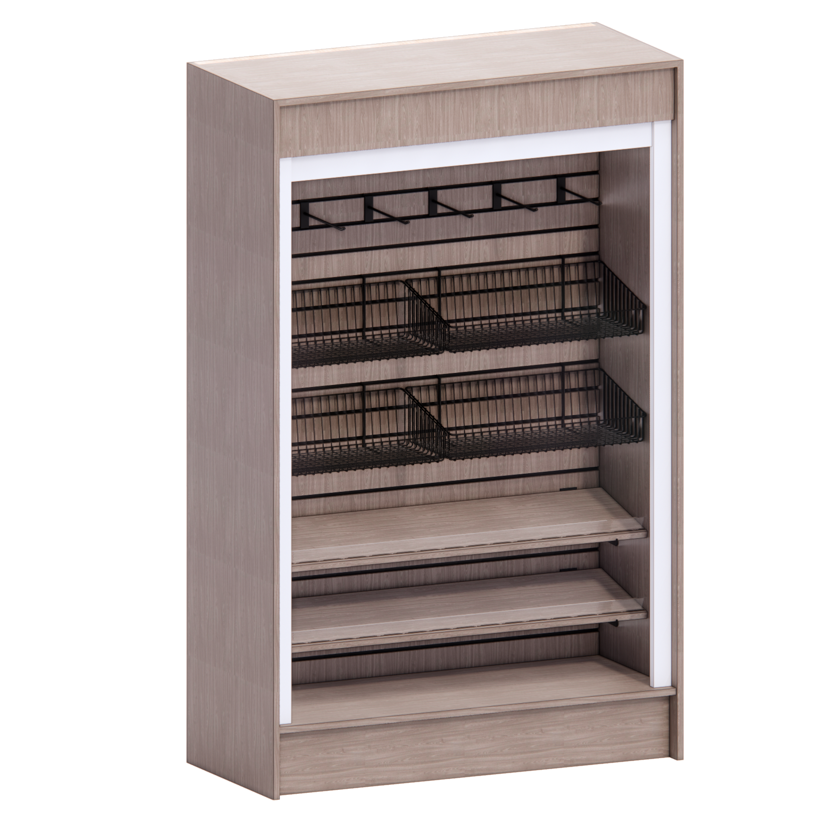 The IFSM-RG, In-Line Free Standing Merchandiser with Roll-Down Gate, is 78” tall. The IFSM-RG features a full-height slat wall and sturdy plywood frame construction. The integrated roll-down gate lets you easily secure the merchandiser, locking contents safely inside when not in use. This merchandiser has multiple hardware packages to amplify your merchandising opportunities. Hardware packages include baskets, slat wall hooks, and adjustable shelves. LED lighting is positioned behind the valance to illuminate your display. The IFSM-RG ships fully assembled.