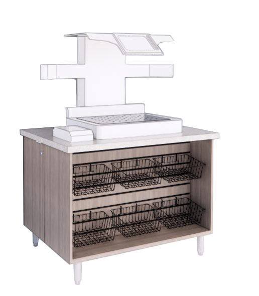 The POS-SSM-4632 Cash Register Station has merchandising space on one side. Baskets can be adjusted to fit whatever impulse products presented at the check-out station. The storage cabinet has doors at both ends of the cabinet. Counter material choices include High Pressure Laminate, Solid Surface, or Quartz stone products. The large countertop space allows for easy cash register or multiple self-pay kiosk layout. Move customers through quickly while adding impulse checkout purchases.